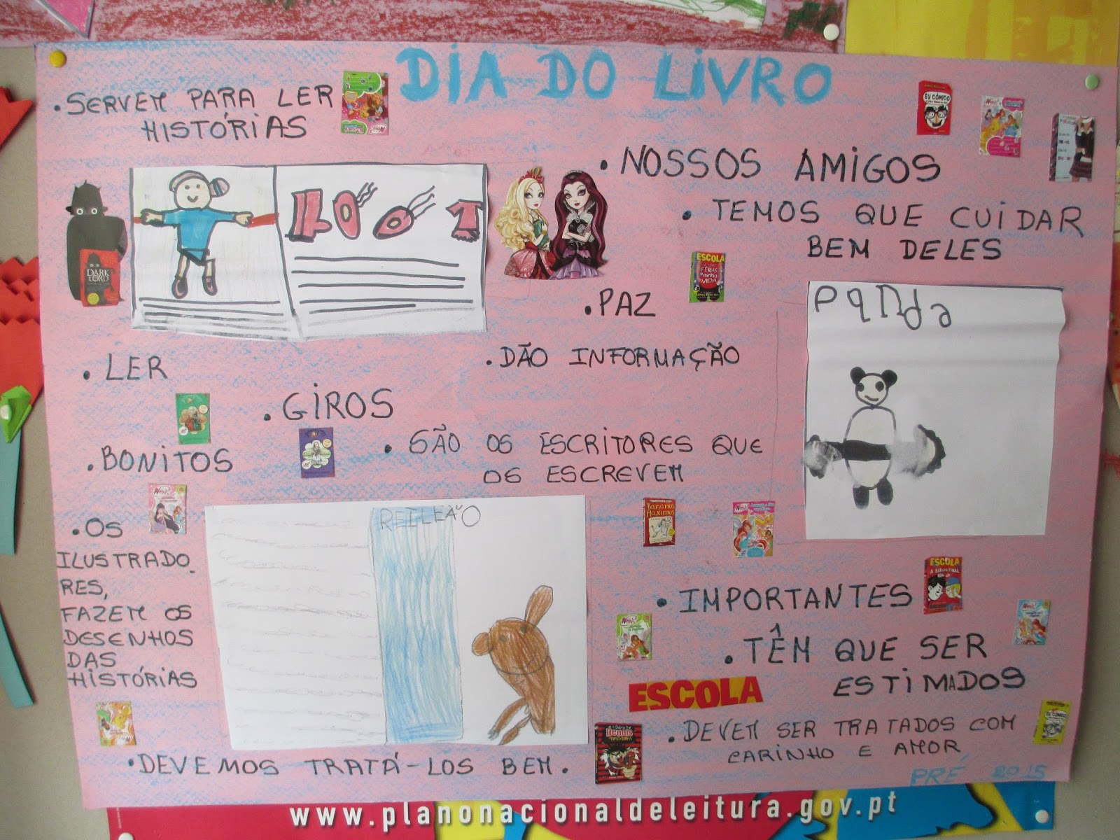 Na biblioteca escolar "Lápis Mágico", a sala do pré-escolar apresentou o cartaz que alunos e educadora elaboraram para comemorar o Dia do Livro.